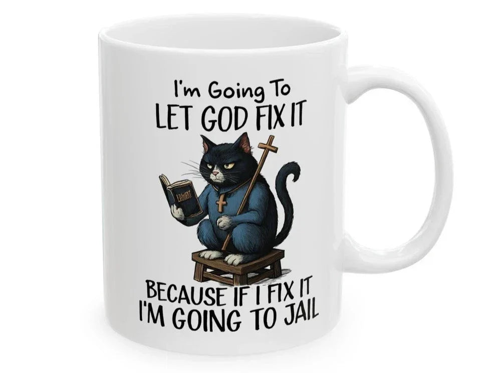 Funny Cat Mug, Let God Fix It Sarcastic Coffee Cup, Christian Gag Gift 11oz